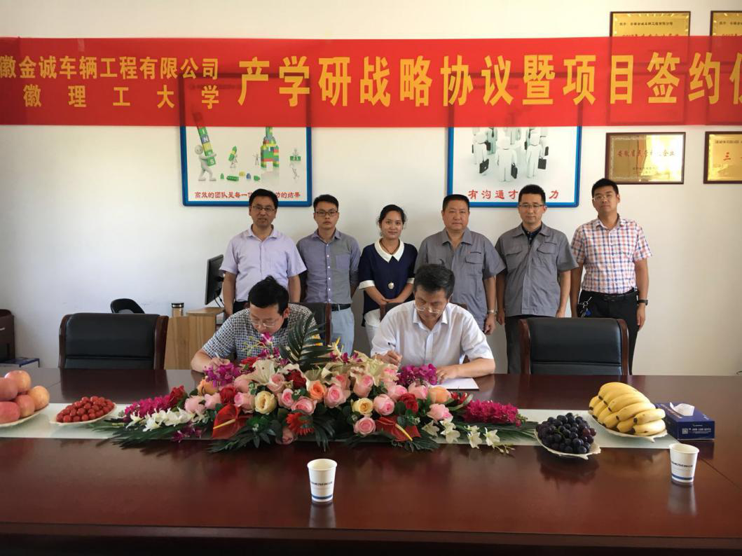 6月12日,安徽金誠車輛工程有限公司與安徽理工大學產學研戰略協議暨項目簽約儀式,在公司會議室舉行。在簽約儀式前,本著互惠互利、促進共同發展,公司董事長孟先鋒、副總經理蔡和泉與理工大學王選副教授一行,就產學研戰略合作及具體項目合作實施進行了深入的交流,參加簽字儀式還有總經理助理牛亞洲等。