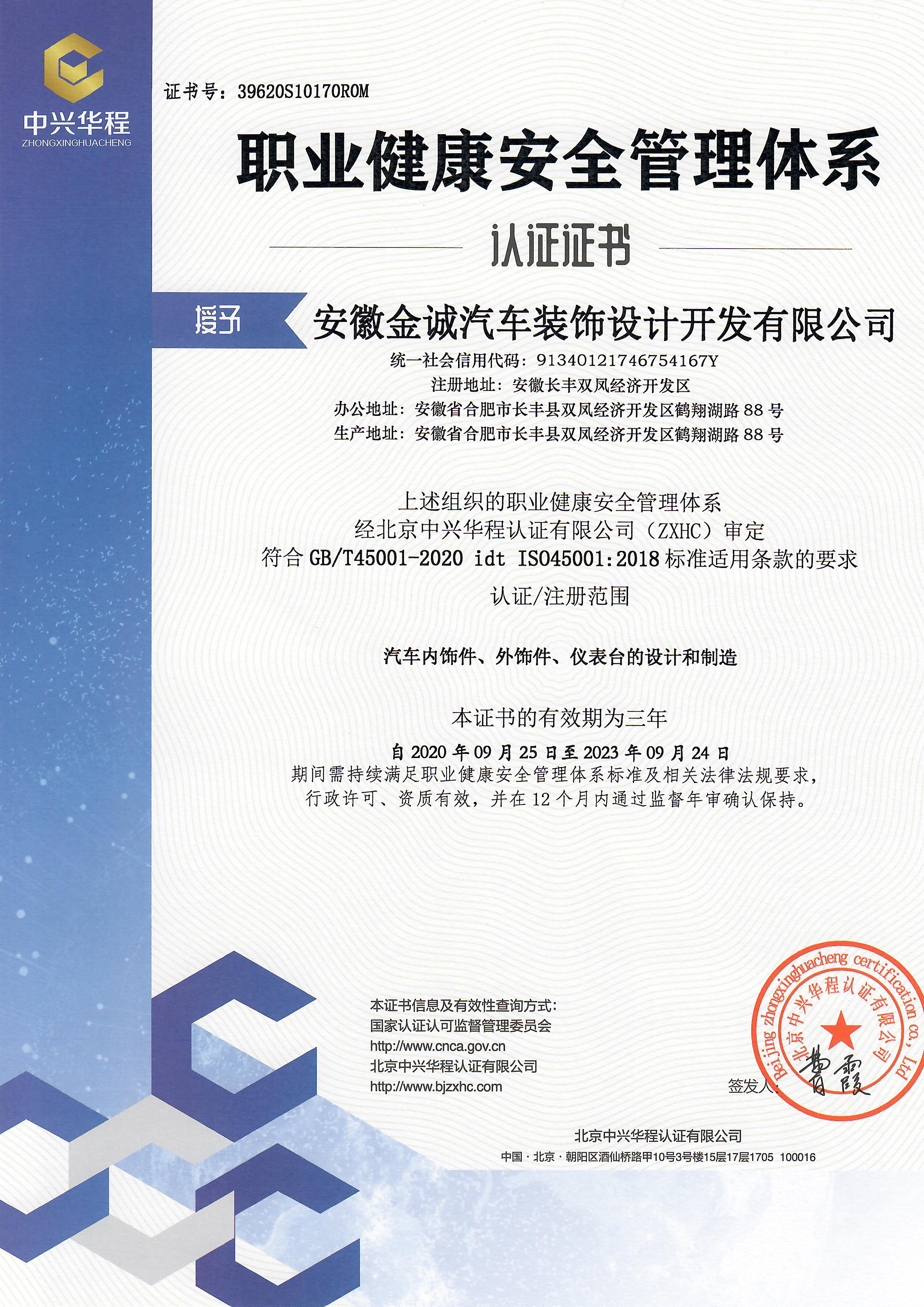 ISO45001職業健康安全管理體系認證證書